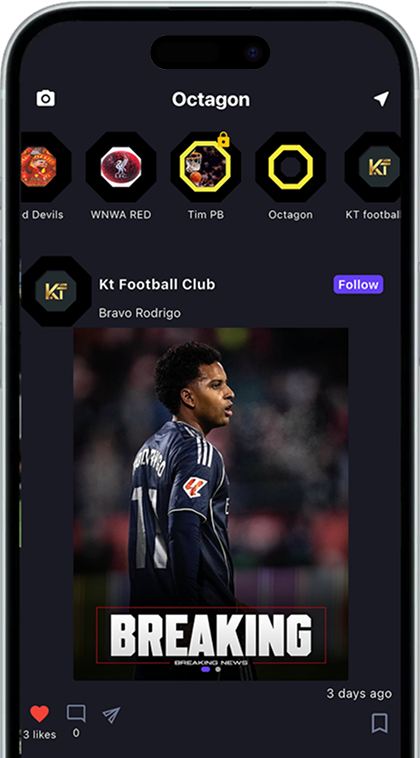 Scroll the feed like it's your club's group chat gone global. Post photos and videos on the public feed and let sports fans, local clubs, and global fan groups discover, like, and engage with your experiences across Octagon App. See clips and takes from real fans drop a like when you feel it, and jump into conversations that actually sound like matchday.